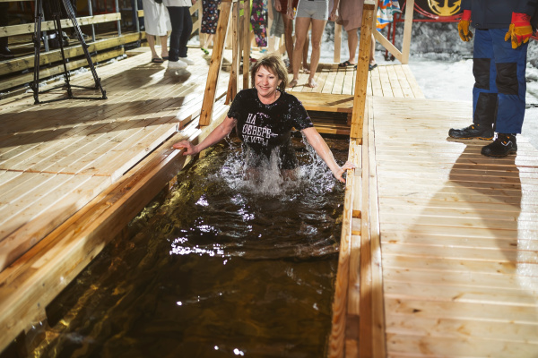 «Нельзя нырять с головой. Это дополнительный шок для организма и риск спазма сосудов головного мозга. Окунаться лучше по шею. Время нахождения в воде для первого раза: от 10 до 30 секунд. И это максимум. Даже если кажется, что можете больше. Цель первого раза — не геройство, а знакомство организма с ощущением. Слушайте тело. Если чувствуете сильную боль, панику, потемнение в глазах — немедленно выходите», — подсказывает специалист.