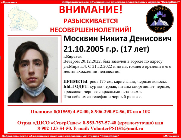 В Кировске разыскивается 17-летний Никита Москвин. Вечером 20 декабря подростка видели на улице Мира, 4. С 21 декабря и до настоящего времени его местонахождение неизвестно.