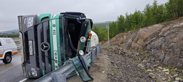 На повороте на улицу Шабалина, на автодороге, которая ведет к Мурманску, перевернулся автобетоносмеситель марки Mercedes. Об этом сообщили в УМВД по Мурманской области.