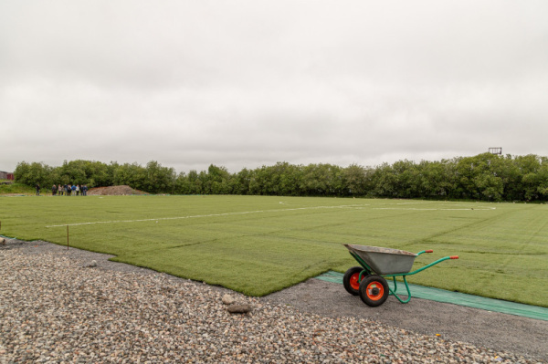 По его словам, на данный момент завершены геодезические работы, проведено выравнивание основания для укладки искусственной травы, а также уложен геотекстиль.