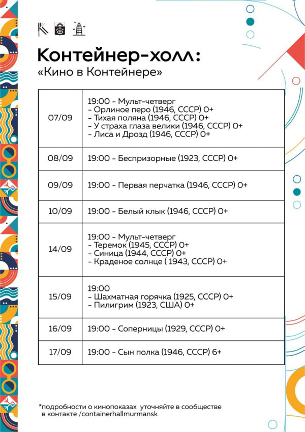 В рамках «Кино в Контейнере» в сентябре пройдут ретро показы советских фильмов. Для юных северян в расписании есть место для мультпоказов.