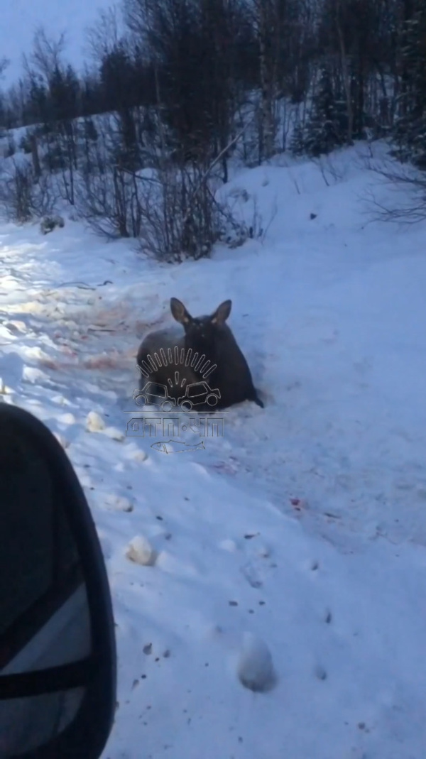 Инцидент случился на участке трассы «Кола» между Мончегорском и Апатитами на 1240 км. Лось пострадал, но выжил и лежит в крови. Водитель автомобиля покинул место происшествия.