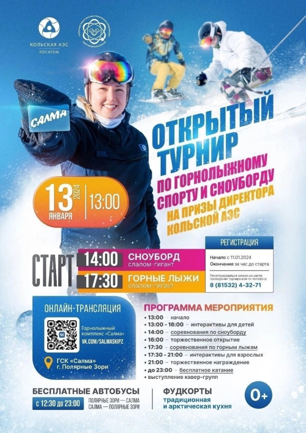 13 января на горнолыжном комплексе Кольской АЭС «Салма» состоится открытый турнир по горнолыжному спорту и сноуборду на призы директора станции, посвященный памяти Ю. В. Коломцева. Соревнования пройдут при поддержке первичной общественной профсоюзной организации работников атомной станции.