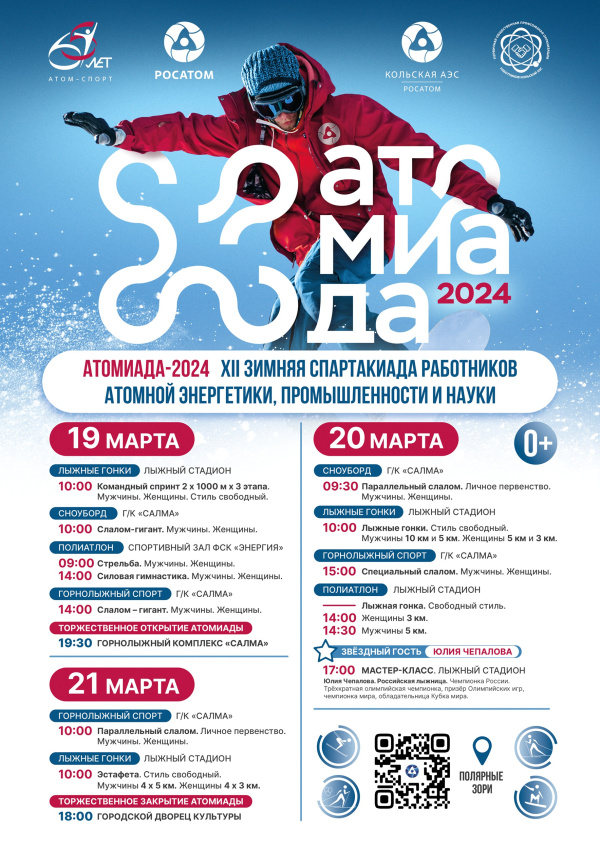 19 - 21 марта 400 спортсменов из городов присутствия Госкорпорации «Росатом» примут участие в соревнованиях по полиатлону, лыжным гонкам, горным лыжам и сноуборду на спортивных сооружениях города Полярные Зории Кольской АЭС. ХII зимняя Спартакиада работников атомной энергетики, промышленности и науки «Атомиада-2024»* объединяет любителей зимних видов спорта со всех уголков страны. В один из конкурсных дней двукратная чемпионка мира, призёр олимпийских игр и заслуженным мастер спорта России Юлия Чепалова проведёт мастер-класс по лыжным гонкам для всех участников соревнований.