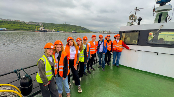 Встреча продолжилась экскурсией на прогулочном катере, организованной службой оценки и развития персонала ММТП. Студенты смогли увидеть величественные краны и легендарные причалы со стороны Кольского залива.