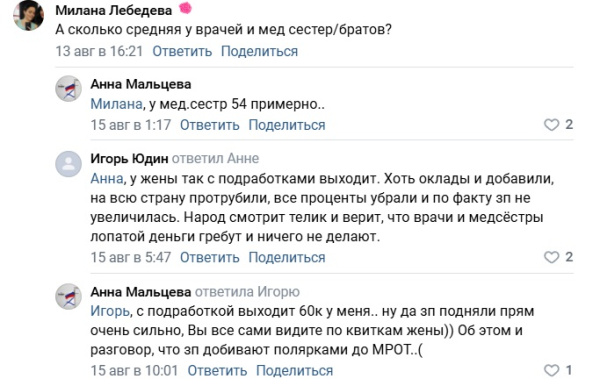 Тему зарплат северяне всегда активно обсуждают в соцсетях. Коснулось это и доходов медицинских работников. На вопрос северянки Миланы Лебедевой, которая спросила, сколько в среднем получают врачи и медсестры, ответили двое жителей Мурманской области. Мурманчанка Анна Мальцева написала, что медсестры зарабатывают примерно 54 тысячи рублей.