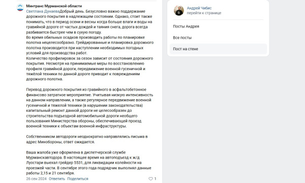 Несколько дней в комментариях под постом губернатора северянка и представители Минтранспорта обсуждали состояние участка дороги. К обсуждению присоединились еще несколько жителей Мурманской области, которые тоже были недовольны качеством выполненных там работ.