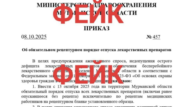 В социальных сетях распространяется очередная дезинформация. На этот раз северяне обсуждают поддельный приказ регионального Министерства здравоохранения. В нем написано, что с 13 октября жители Кольского Заполярья смогут купить все медикаменты только по рецептам.