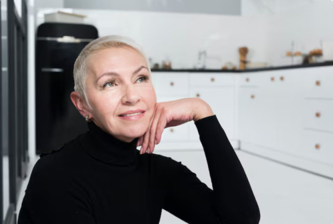 2. Пикси с удлинённой чёлкой могут визуально молодить свою обладательницу. Чёлка делает внешний вид мягким и элегантным, а короткие виски и затылок делают акцент на выразительности глаз и подчёркивают линию скул.