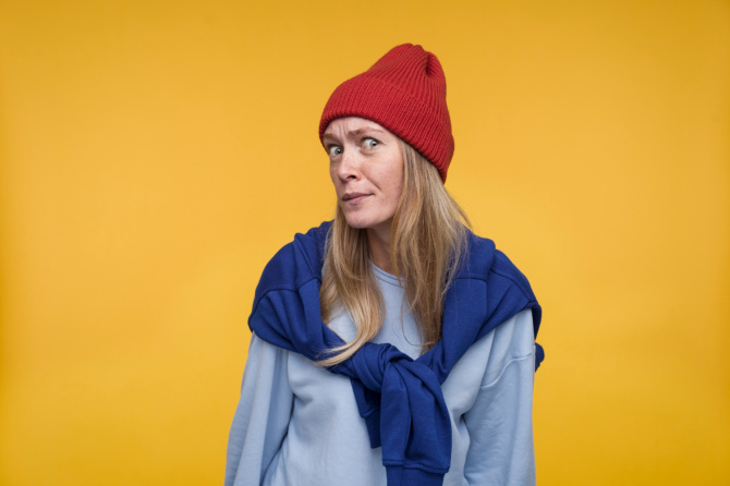 2. Шапки с меховыми помпонами в городской среде больше уместны на загородных выездах, несмотря на то, что сейчас на рынке множество заманчивых предложений. Для работы над ошибкой выберите шапку-бини с высокой тульёй.