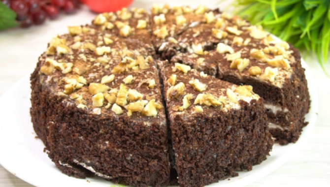 Для этого возьмите 500 грамм сметаны, смешайте с сахарной пудрой, пока она не растворится. Настало время собирать сам торт. Возьмите первый корж, смажьте полученным кремом, положите сверху другой. Постройте слоёный торт. В конце добавьте для украшения либо изюм, либо грецкие орехи. Не забудьте смазать бока торта кремом и обсыпать его какао. Как только торт пропитается, его можно сразу же подавать к чаю.
