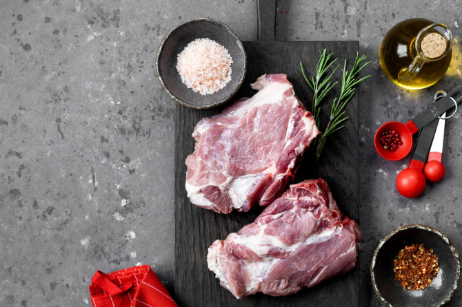 Нам потребуется: свинина, растительное масло, морковь, соль, чёрный перец, квашеная капуста, петрушка, укроп, розмарин, 2 лавровых листа. Для приготовления возьмите увесистый кусок свинины, примерно 1 кг. Разделите так, как вам удобно.