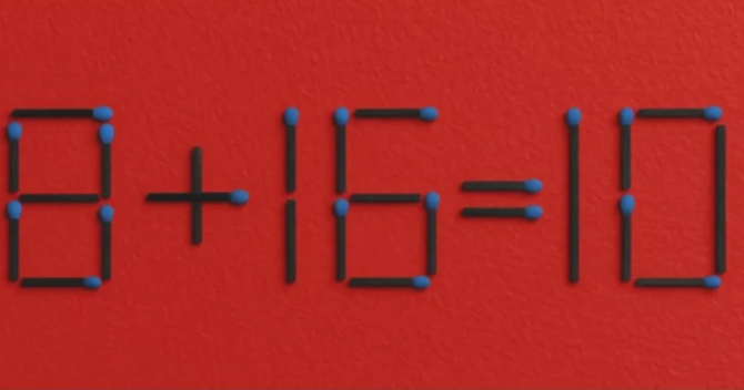 Итак, на изображении мы видим пример, который решён вопреки всем арифметическим правилам. Подумайте, как можно исправить ситуацию. Нужно переставить одну спичку, чтобы вышло правильное равенство.