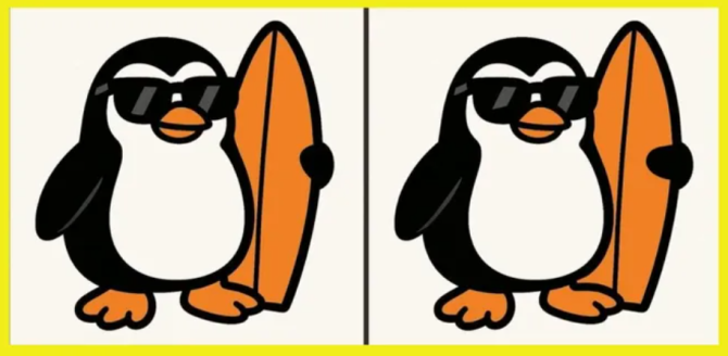 Посмотрите на две иллюстрации, на которых изображён пингвин с доской для серфа в очках. Между этими картинками всего 3 отличия — их и предстоит отыскать. Засеките время на 14 секунд и отправляйтесь на поиски.
